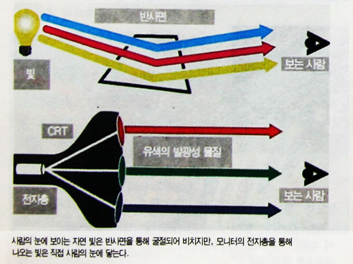 눈은 사진기와 그 구조의 유사성으로 곧잘 비교되는데, 이런 때는 눈의 입력 기능이 강조되었다. 그러나, 눈이 가진 출력 기능쪽으로 관심을 돌린다면, 눈은 컴퓨터의 모니터와 아주 유사한 구조를 가졌다. 지나친 억지일까? 자, 이제부터 사람의 눈과 컴퓨터의 모니터를 연결하는 논리를 쌓아보자.