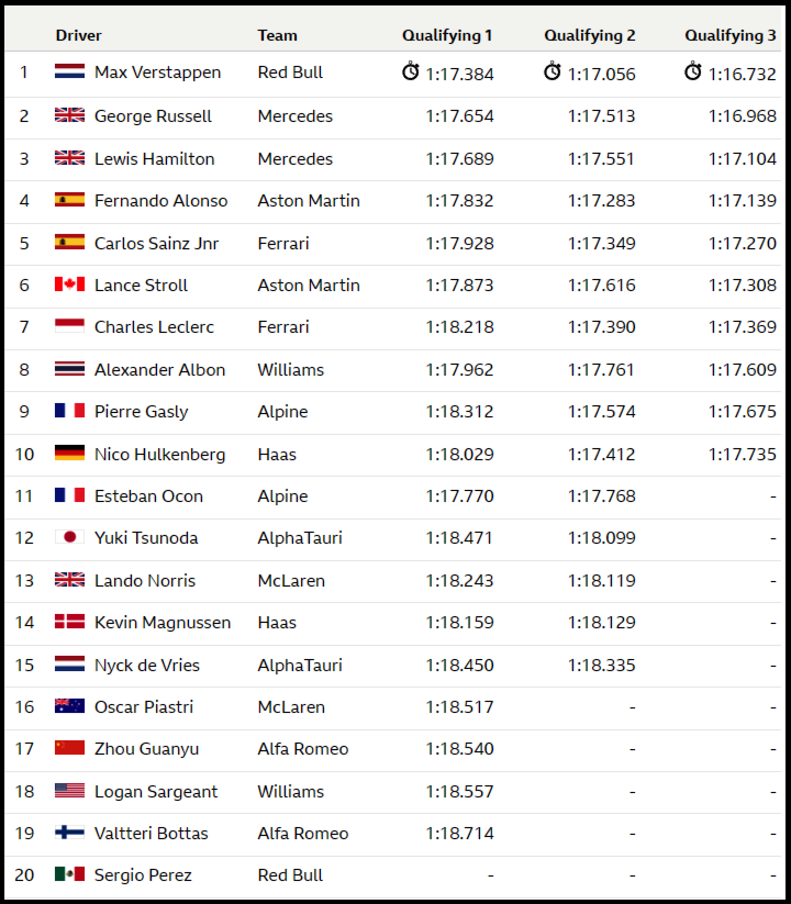| F1.2023.R04 - 아제르바이잔 그랑프리 예선 결과 (F1 2023 Azerbaijan GP Qualifying Results) (0) | 2023.04.28 |