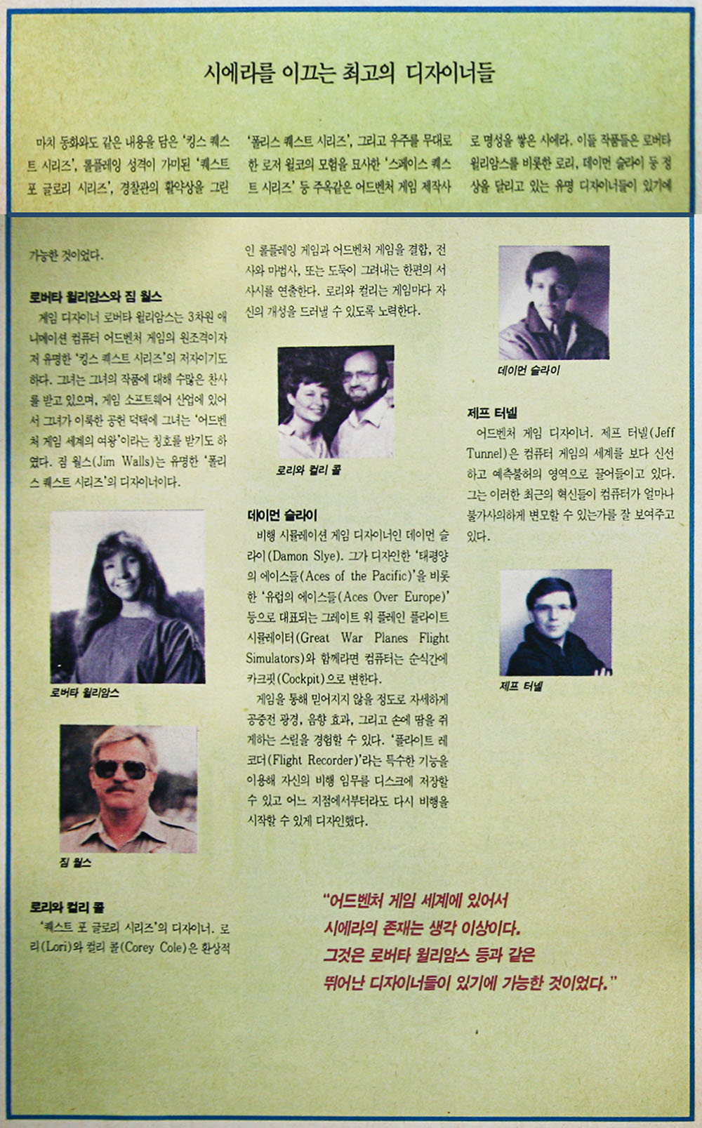 시에라의 프로그래머팀과 애니메이터팀, 그리고 음악팀들은 자신들이 하고 있는 일이 데이터베이스나 스프레드시트가 아닌, 앞으로의 오락 시장을 지배하게 될 일종의 영화 예술의 한 분야임을 잘 알고 있는 것이다. 시에라는 현재 1988년 일본에 시에라 재팬을 설립한 데 이어 1990년 10월에는 영국에 유럽 사무소를 개설하는 등 전세계를 향해 뛰고 있다.