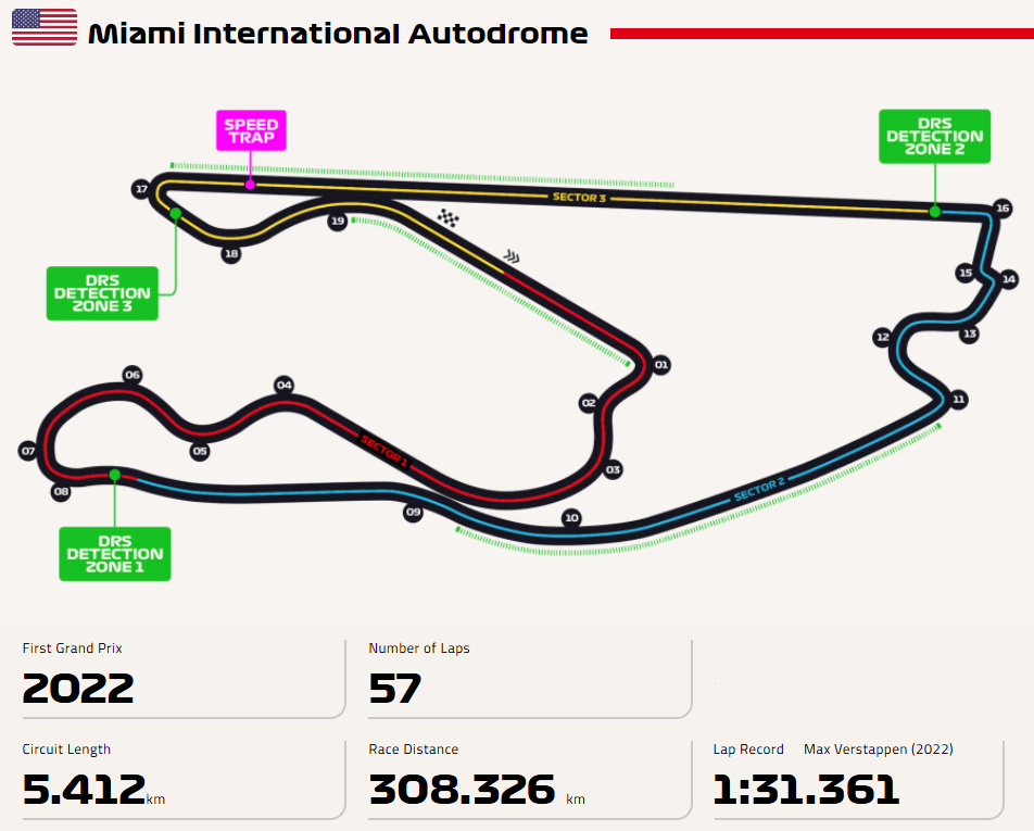 마이애미 국제 오토드롬 (Miami International Autodrome)은 미국의 플로리다주 마이애미 가든스의 마이애미 교외에 있는 하드록 스타디움과 그 주변에 특별히 설계된 임시 서킷 입니다. 트랙의 길이는 5.412km이며 19개의 코너가 있으며 예상 평균 속도는 약 223km/h 입니다.