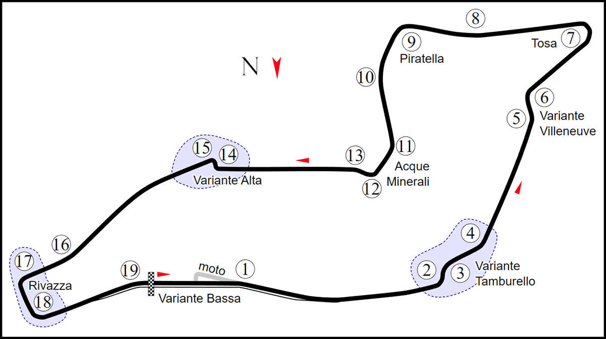 19개의 코너로 이루어진 4.909 km의 이 서킷은 1994년 아일톤 세나가 사고로 죽은 곳이며 세나가 죽기 하루전 열린 예선에서 Roland Ratzenberger도 Villeneuve 코너에서 고속 충돌 사고로 인해 사망했습니다.