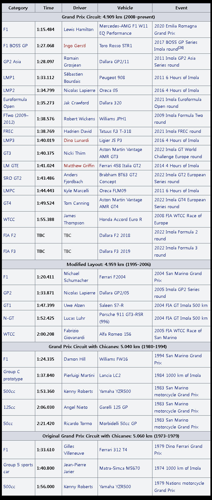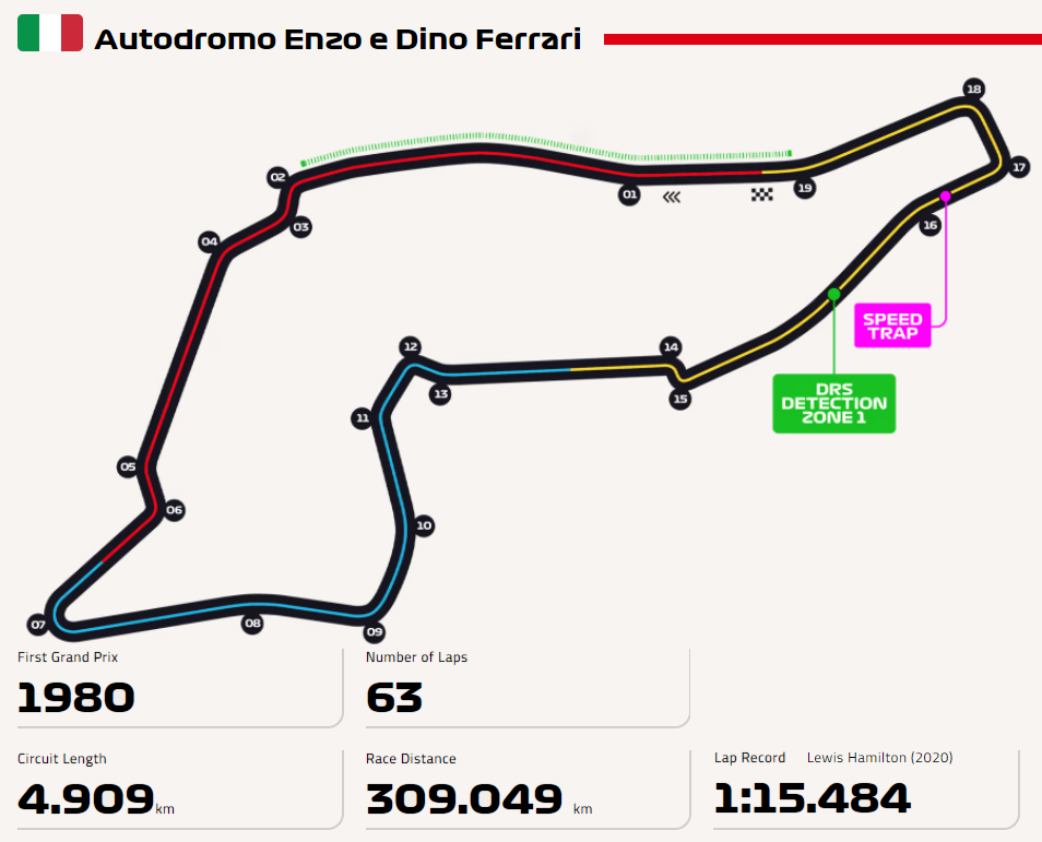 이몰라 서킷은 F1서킷중에서 시계 반대 방향으로 달리는 몇 안되는 서킷 중 하나이며 이 서킷의 공식적인 이름은 페라리의 설립자 Enzo Ferrari 와 그의 아들 Alfredo Ferrari 의 이름을 따서 명명되었습니다.