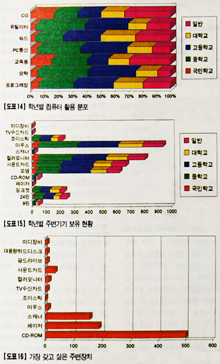 현재의 컴퓨터 이용자가 가장 필요로 하는 주변장치는 무엇일까? 시대가 시대인 만큼 역시 CD-ROM으로 나타났다. 응답자의 50% 이상이 CD-ROM을 원하고 있어 멀티미디어에 대한 관심이 높아지고 있음을 의미하기도 한다. 컴퓨터 보유현황을 보아도 386급 이상의 컴퓨터 보유자가 많았고 또 이들이 화려한 그래픽이 담긴 CD-ROM 드라이브를 가지고 싶어하는 것은 당연한 결과라고 볼 수 있다.