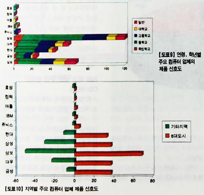 연령, 학년별로 좋아하는 제품의 인기도는 <표 9>와 같다. 삼보컴퓨터의 인기는 학년별 뿐아니라 지역별 분포에서도 모두 선두를 달리고 있다.<도표10>