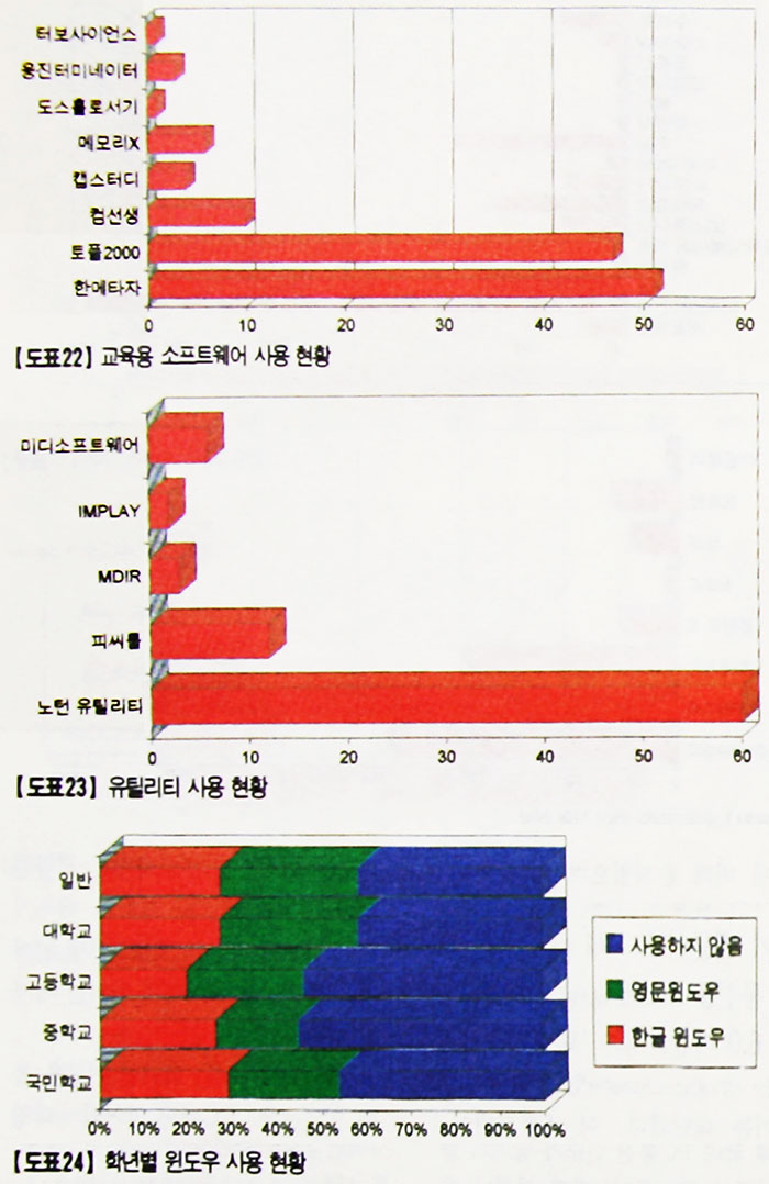 그리고 교육용 프로그램 항목에 응답한 독자는 20% 미만이었으며 이 수치도 초, 중, 고등학생이 대부분인 것에 비하면 우리나라 학생들의 교육용 소프트웨어 활용은 매우 저조하다는 것을 알 수 있다. 토플2000 소프트웨어 보유자가 2위를 차지한 것을 보면 컴퓨터 사용자의 영어에 대한 관심이 높음을 보여준다 <도표22>.