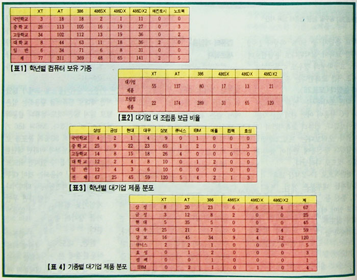 한편, 대도시와 지방과의 컴퓨터 이용환경에 큰 차이가 2년전에 비해 현저히 줄어든 것에도 주목할 만하다. 486 기종에서는 조립제품의 비율이 80% 이상을 차지하는 것은 확장성과 가격면에서 장점을 내세우고 있는데 뒤늦게 가격인하로 뛰어든 대기업 제품의 선전을 기대해 봄직하다.