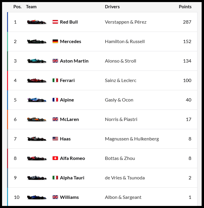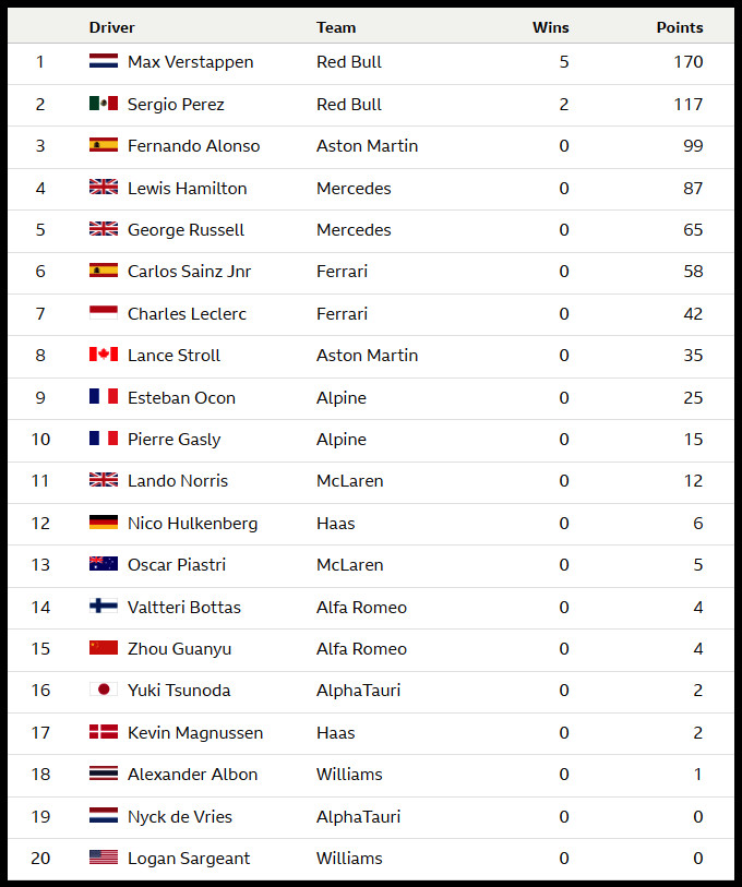 현재순위 베르스타펜 사인츠 스트롤 해밀턴 오콘 알론소 러셀 훌켄버그 저우관유 페레즈 츠노다 피아스트리