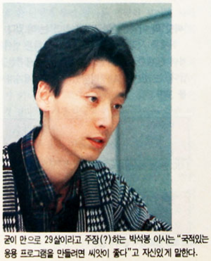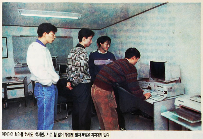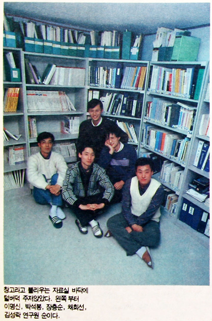 지금, 씨앗 개발은 모두 다섯명이 한다. 기본 틀을 잡고, 컴파일러의 전방처리기 작업을 맡은 박석봉(30)씨, 한글 입출력 문제를 해결하는 통합 환경 에디터 작업을 맡은 채희선(28) 씨, 컴파일러의 후방처리기 작업을 담당한 장충순(28)씨, 링커 개발에 전념하는 이명신(26)씨, 씨앗에서 편리하게 쓸 수 있게 하는 라이브러리 개발을 맡은 김성락씨(25) 씨가 팀을 이루고 있다. 공업화학을 전공한 채희선씨 말고는 모두 컴퓨터를 전공했다.