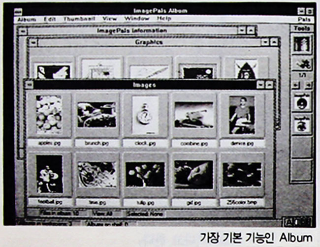 CD-ROM 드라이브는 그래픽 이미지들이 대량으로 들어있는 저장 장치로 이용될 수 있다. 유-리드(U-Lead) 시스템사가 만 든 이미지팔스(ImagePals) 1.2는 PC가 가질 수 있는 그래픽 이미지 관리/처리 기능을 손쉽게 즐길 수 있도록 하는 소프트웨어이다. MS-윈도우 3.0/3.1 환경에서 운용된다. 필자는 한글 윈도우 3.1에서 사용했는데, 윈도우 3.0에서는 다소 기능 제한이 있다고 한다.