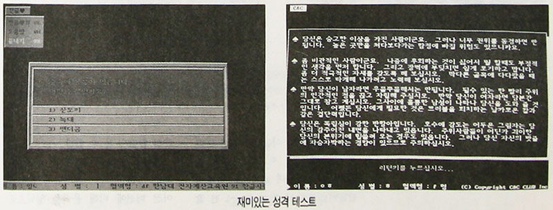 문제를 다 풀고 나면 해설을 해 주는데, 이는 시작할 때 입력했던 혈액형, 성별에 기초하여 문제에 답한 것을 분석한 것이다. 문제를 풀때는 <1> ~ <4>키와 <스페이스바>를 누르고 해설은 <리턴>키를 누른다.