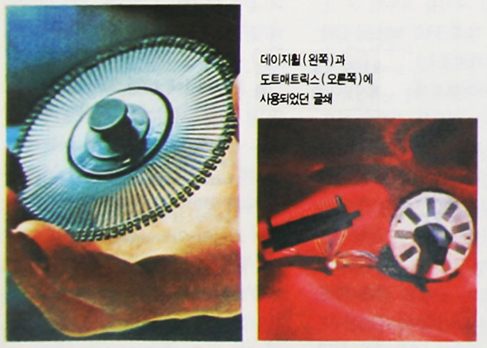 타자기처럼 하나 하나의 글쇄가 글을 찍어내니 당연히 글자의 크기를 변화시킨다는 것은 상상도 할 수 없는 일이었다. 그런데도 데이지휠이 그렇게 인기를 모았던 것은 출력이 아주 깔끔했고, 문서 형식을 출력하기에는 더 없이 편리했기 때문이었다.