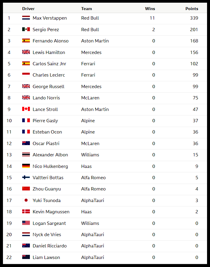 현재순위 베르스타펜 페레즈 사인츠 알론소 츠노다 가슬리 러셀 알본 오콘 노리스 해밀턴 피아스트리