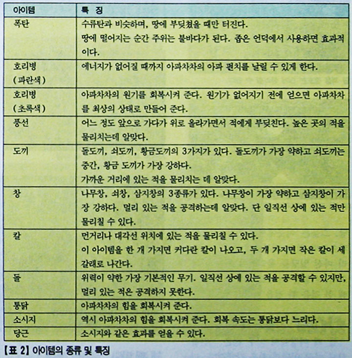 아이템의 종류 및 특징은 <표 2>와 같다.