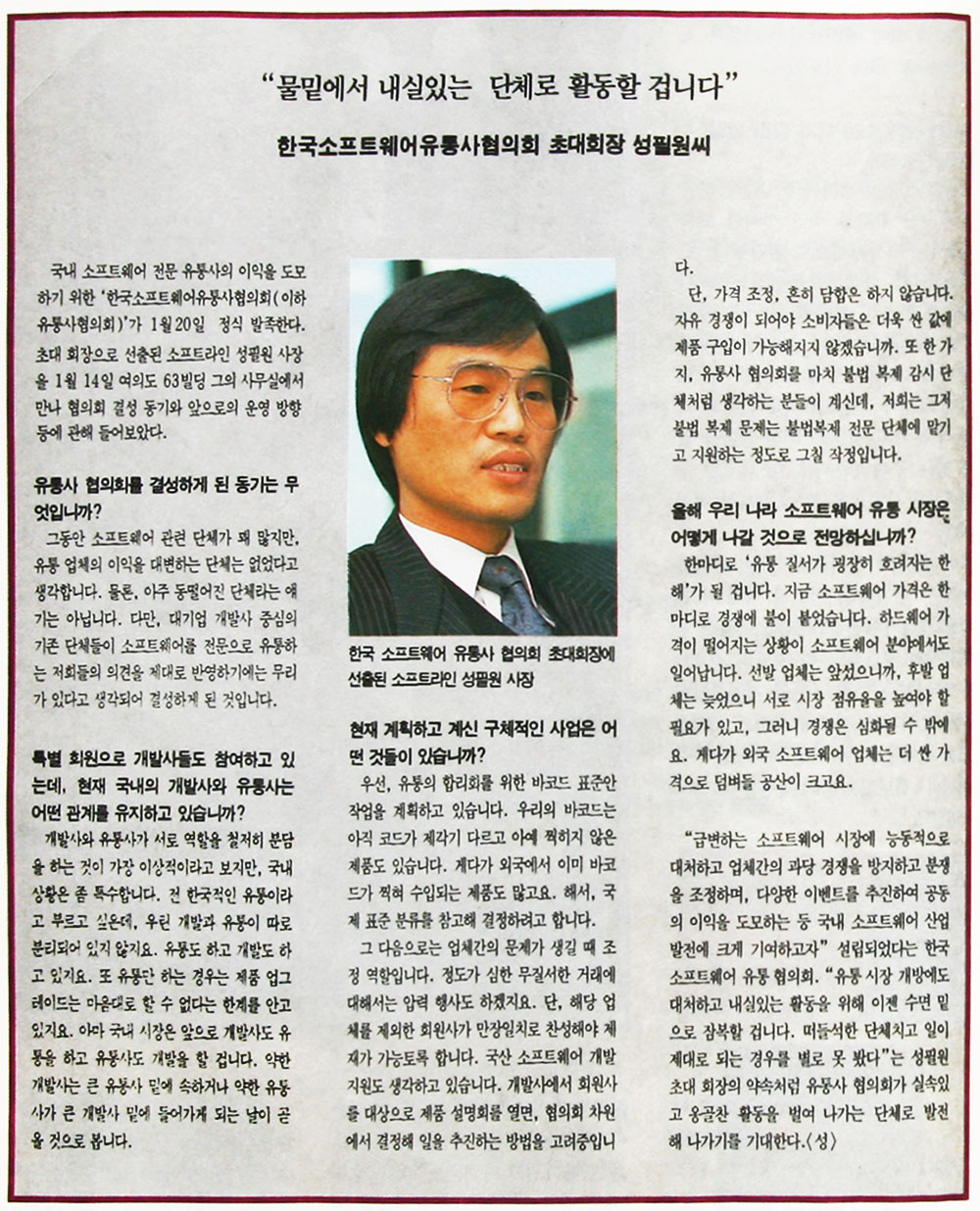 소프트웨어 전문 유통업체 18개사가 모여 1월20일 창립 총회를 갖고 '한국 소프트웨어 유통사 협의회'를 발족시켰다. 대우, 라이카, 러브리, 삼테크, 선경유통, 소프트라인, 소프트타운, 씨디에스, 아프로만, 에스비케이, 인포텍 트라이콤, 한국소프트, 한국통신소프트웨어 프라자 등 일반 회원 14개 유통사와 다우데이타시스템, 로터스 코리아, 마이크로소프트, 한글과 컴퓨터 등 4개사의 공급사가 특별회원으로 참여하고 있는 이 협의회에는 회장에는 소프트라인 성필원 사장을 선출하고, 총무에 소프트타운 신근영 사장을 선임했다.