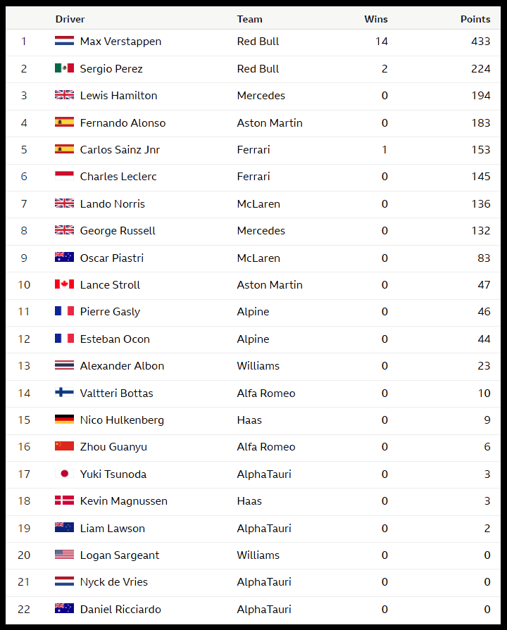 F1 2023 시즌 전체 상황표