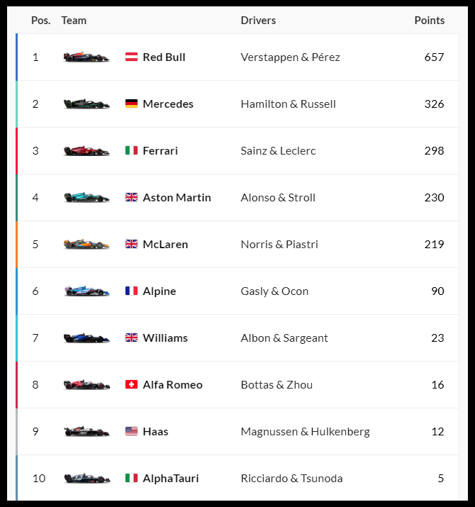 멕라렌은 최근 가장 가파른 상승세를 보이면서 이번 레이스에서도 2위와 3위를 기록하며 점점 퍼포먼스가 떨어지고 있는 애스턴 마틴에게 11포인트차이로 따라 붙으면서 조만간 역전을 할 것으로 보입니다. 그러나 남은 경기가 그리 많지 않기 때문에 애스턴 마틴은 추월하더라고 3위인 페라리와 팀 순위 2위인 메르세데스를 잡기에는 조금 늦은감이 있어 보입니다.