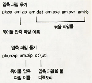 pkzip은 묶는 것과 푸는 프로그램이 서로 다르다. 아크마스타라는 프로그램에 필요한 파일 AM.DAT. AM.EXE, AM.OVR, AM.EXE의 네개는 총 바이트 수가 69만3천90 바이트였는데, 이를 묶은 AM.ZIP 이란 파일의 용량은 498256이었다.