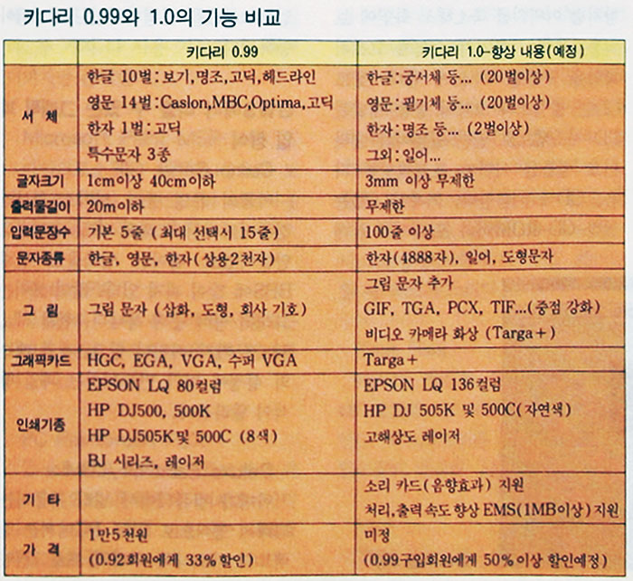 한편, 이러한 인쇄용 프로그램에서 중요하게 다룰 문제가 바로 글꼴이다. 키다리의 글꼴은 자체개발한 것이라 하고('집현전' 이란 자형편집기도 완성되었다고 한다) 한글이 10벌, 영문은 14벌을 쓸 수 있으며 2천여 상용한자가 지원된다. 이 정도라면 배너의 글꼴로는 충분해 보이며, 나머지 능력 발휘는 글꼴을 다루는 기능과 사용자의 상상력 차지가 될 것이다.