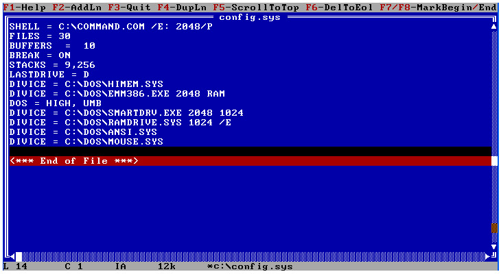 다음에 나오는 EMM386.EXE는 386 이상의 컴퓨터에서 확장 메모리를 흉내내고 상위 메모리 영역을 사용할 수 있도록 하는 디바이스 드라이버로 2048KB만큼 증설 메모리를 확장 메모리로 바꾸어 준다(④). 만약 램이 충분하다면 더 큰 숫자를 지정해도 상관없다.