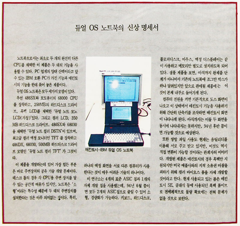 '94년 새해, 신선한 소식 거리를 찾아 헤매던 기자들의 귀를 번쩍 뜨이게하는 꺼리가 하나 있었다. "IBM PC와 매킨토시 컴퓨터가 노트북에서 함께 작동된다?" 그 즉시 이 내용은 'IBM-매킨토시 동시 호환 PC 개발, 년 10만대 수출 예상' 등 문구로 기사화되어 전국으로 퍼졌다. 게다가 모 일간지에서는 '세계 최초'라는 수식어까지 첨가해 일반인들의 궁금증을 증폭시켰다.
