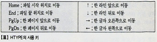 HTYPE.EXE는 한글 워드프로세서를 이용하지 않고서 프로그램 매뉴얼을 보고 싶다거나 도스 상태에서 한글 파일을 읽어들이고자 할 때 도움이 되는 프로그램이다. 이 유틸리티는 용량도 작고 사용방법도 간단하여 도스에 설치해 놓으면 유용하게 사용할 수 있을 것이다. 또한 압축파일이 아니므로 따로 압축을 푸는 번거러움 없으며, 한글 문서 뿐 아니라 'E'로 옵션을 주면 영문 문서도 읽어들일 수 있다.