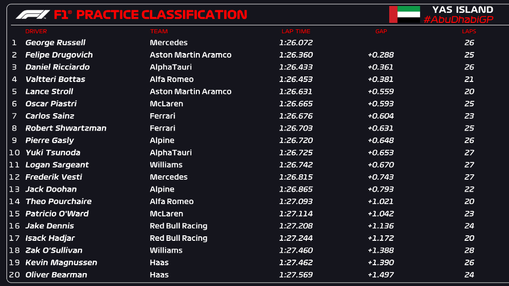 시즌 마지막 그랑프리인 아부다비에서 레드불의 베르스타펜이 이번 시즌 13번째이자, 아부다비 그랑프리 4년 연속 폴포지션을 차지했고 르끌레르가 약간의 차이로 2위를, 멕라렌의 피아스트리가 팀 동료인 노리스에 앞서 3위를 차지했습니다.