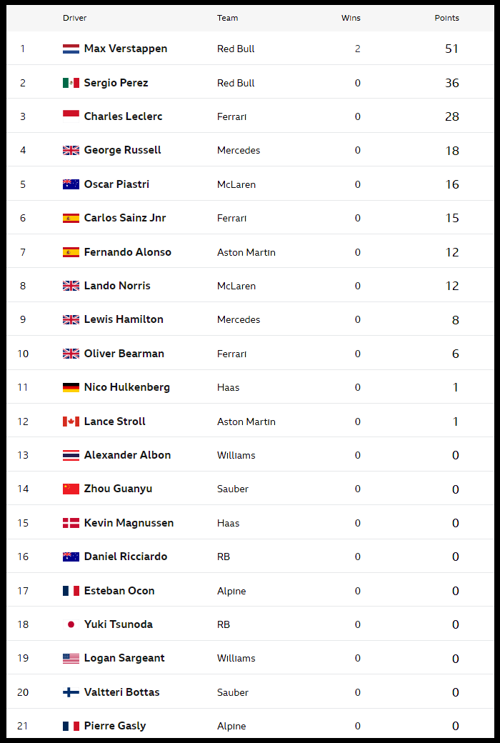 드라이버별 2024 시즌 성적표 (순서는 2023시즌 팀 순위)