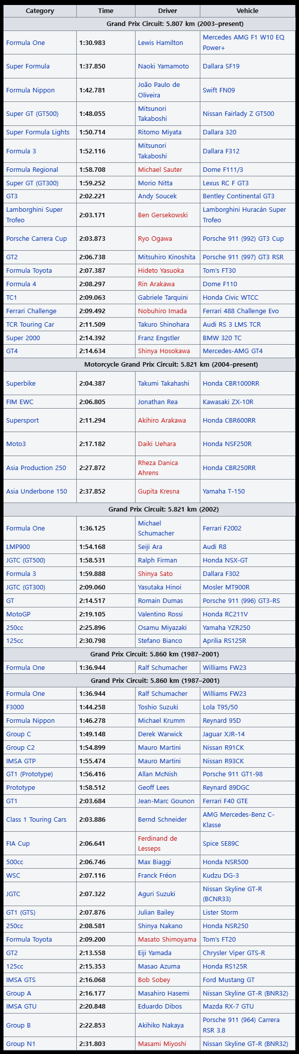 일본의 미에현에 위치하고 있는 스즈카 인터내셔널 서킷은 1962년에 개장되었으며 혼다 자동차가 소유하고 있습니다. 첫 F1 그랑프리는 1976년에 열렸으며 중간에 '후지 스피드웨이'에서 2007년과 2008년에는 개최되었다가 그 이후로는 스즈카 서킷에서 개최되고 있습니다.