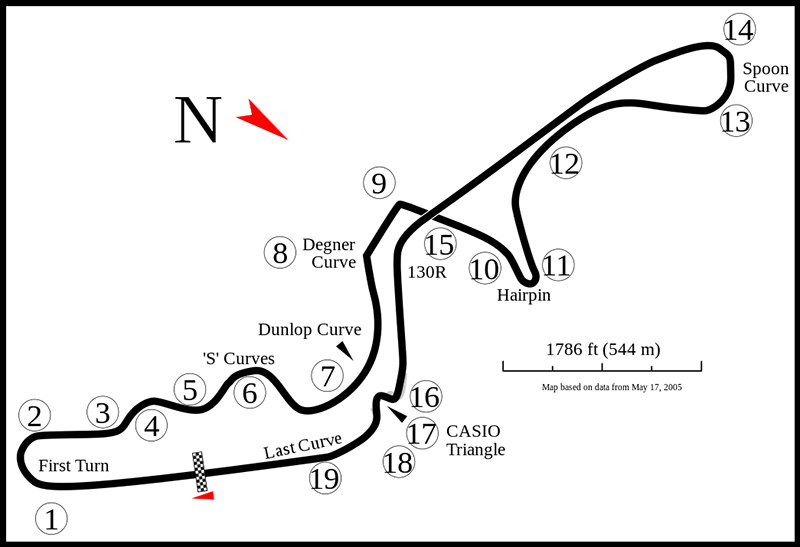 5.807km 길이의 트랙은 18개코너로 이루어져 있는 스즈카 서킷은 F1 서킷중에서 유일하게 트랙위를 트랙이 지나가는 8자 형태를 모양을 가지고 있으며 3번코너에서 6번 코너로 이어지는 마치 슬라럼 같은 S자코스와 130R 코너가 가장 유명하며 특히 130R코너는 대형사고나 많이 나기로 악명이 높습니다.