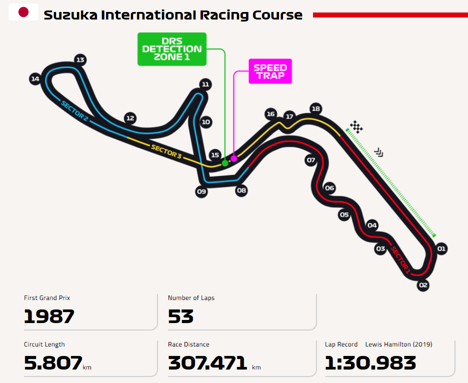 5.807km 길이의 트랙은 18개코너로 이루어져 있는 스즈카 서킷은 F1 서킷중에서 유일하게 트랙위를 트랙이 지나가는 8자 형태를 모양을 가지고 있으며 3번코너에서 6번 코너로 이어지는 마치 슬라럼 같은 S자코스와 130R 코너가 가장 유명하며 특히 130R코너는 대형사고나 많이 나기로 악명이 높습니다.