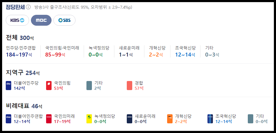 각 정당별 전체 의석수 출구조사 예상