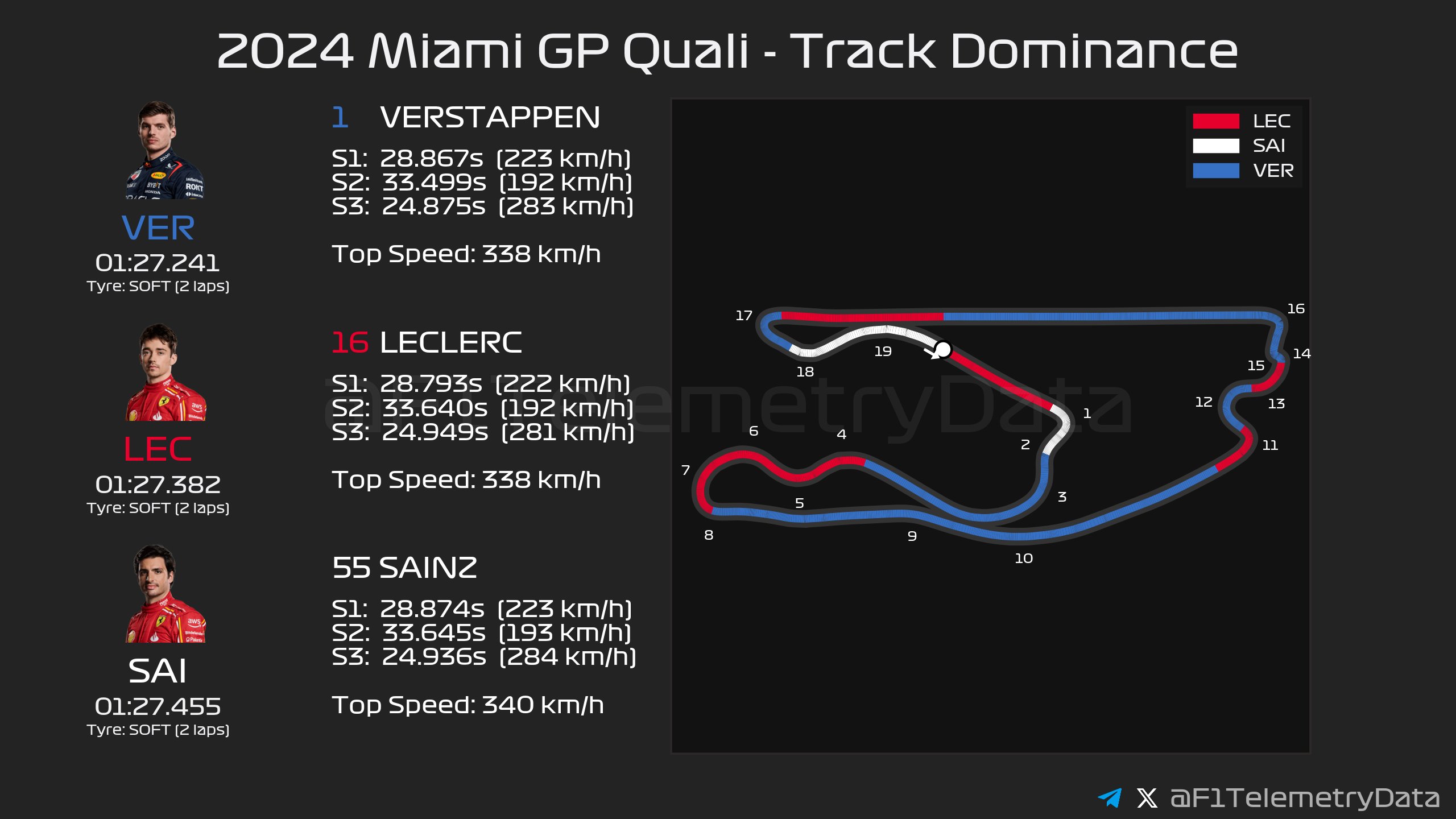 마이애미 그랑프리는 2022년에 처음으로 개최되었으며 첫 대회에서 페라리의 르끌레르가 폴포지션 차지했고 사인츠가 2그리드를 가져가서 페라리가 프론트 로우를 차지했지만 레이스에서 레드불의 베르스타펜이 페라리의 두 드라이버를 추월하고 우승을 차지했습니다.
