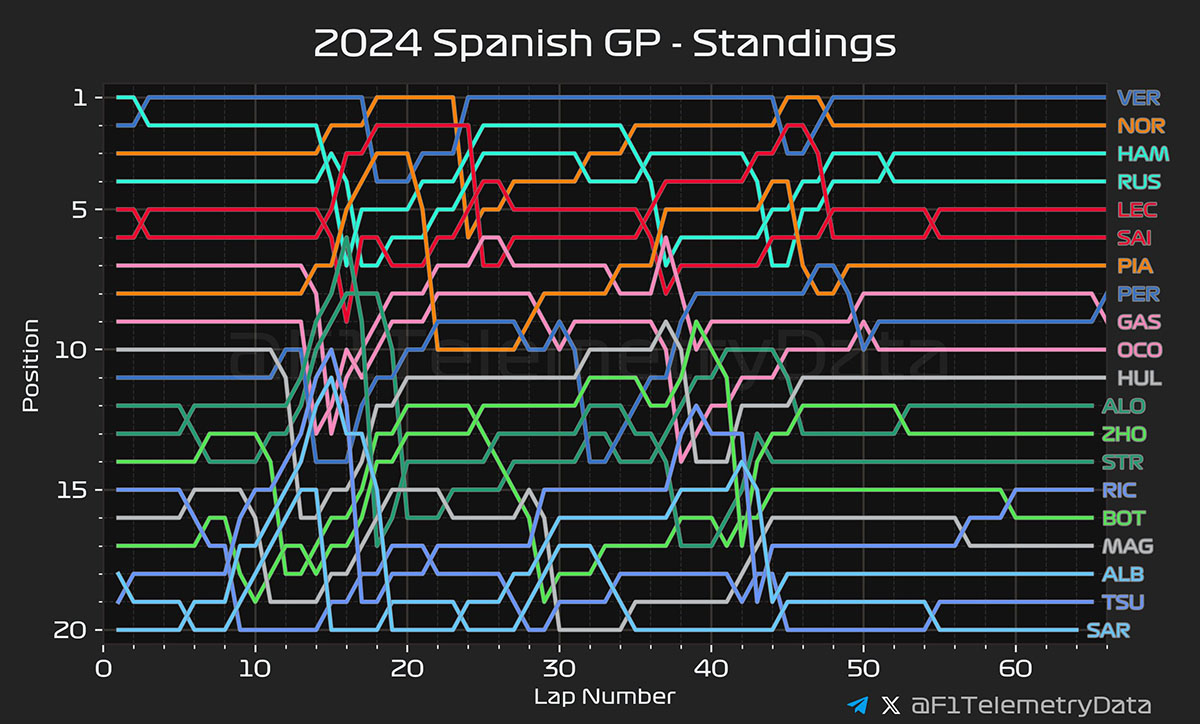 START 4그리드의 러셀이 선두로 올라섬. 베르스타펜 노리스 추월해서 2위. 사전트 리카르도 추월하며 18위. 피아스트리 오콘 추월하며 8위. 큰 사고 없이 첫 코너를 모두 잘 지나감.
