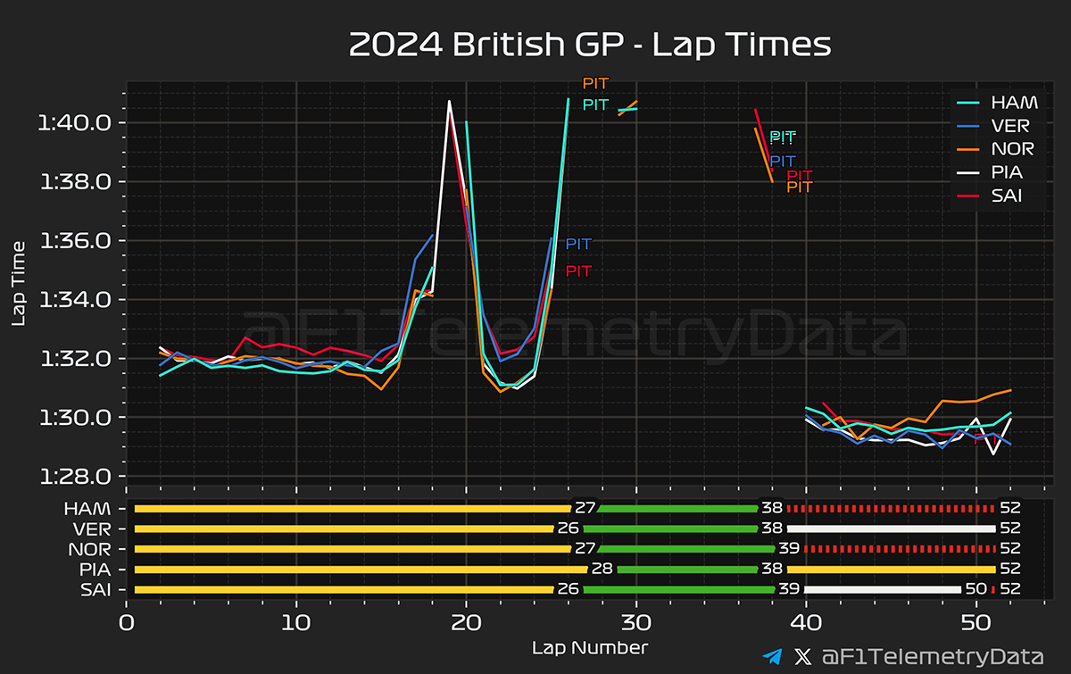 LAP 20 노리스 해밀턴 추월하며 선두. 피아스트리 러셀 추월하며 3위. 르끌레르 페레즈 오콘 피트스탑 인터미디어트 교체. 피아스트리 해밀턴 추월하며 2위.