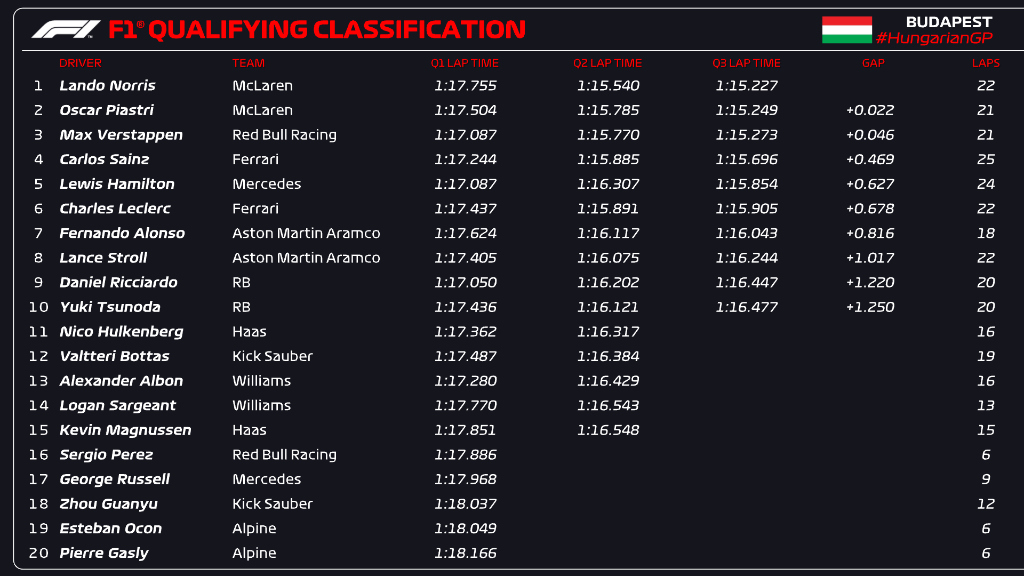 (F1 2024 Hungary GP Qualifying Results)