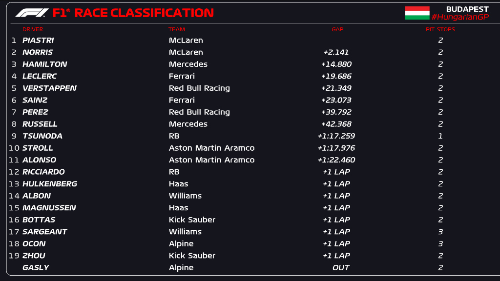 F1.2024.R13 - 헝가리 그랑프리 레이스 결과