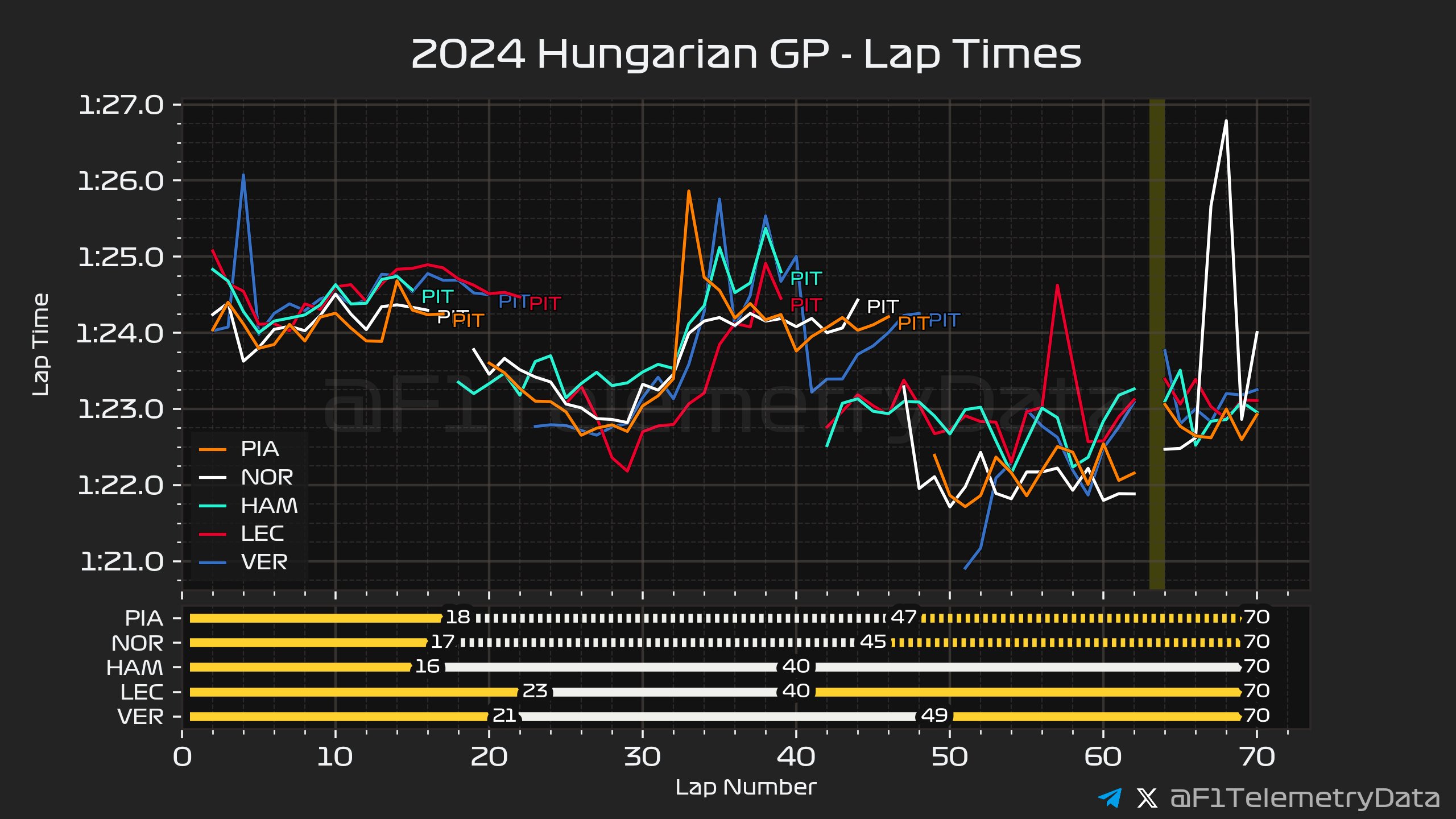 LAP 19 피아스트리 피트스탑 하드타이어로 교체후 4위로 복귀. 해밀턴 패스티스트 랩.