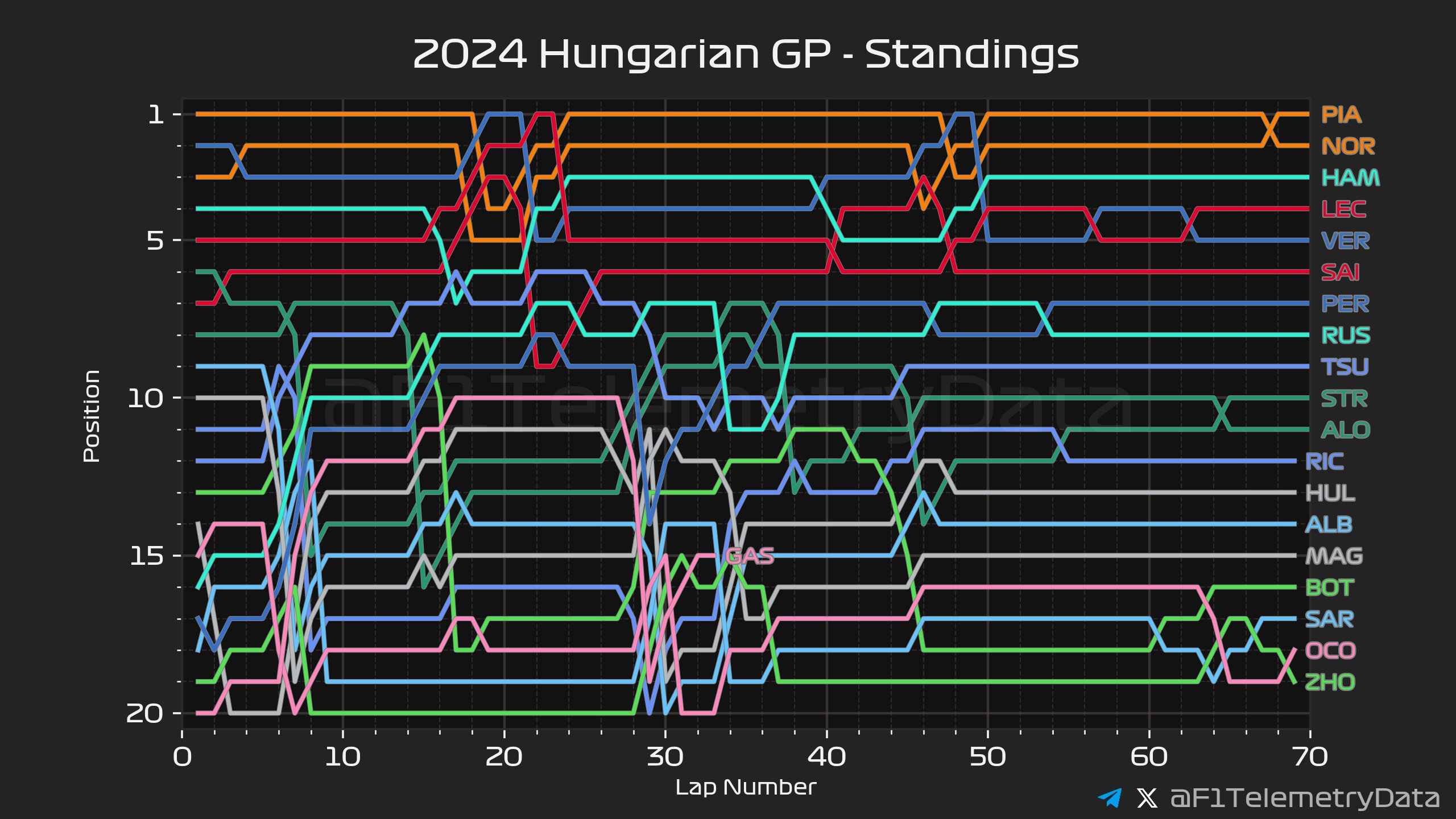 START 피아스트리 노리스 추월하며 선두. 베르스타펜 트랙을 벗었나다 들어오며 노리스 추월하며 2위. 해밀턴 4위로 올라옴. 16그리드 출발한 페레즈 18위로 밀려남.