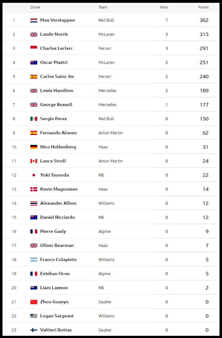 F1 2024 시즌 전체 상황표