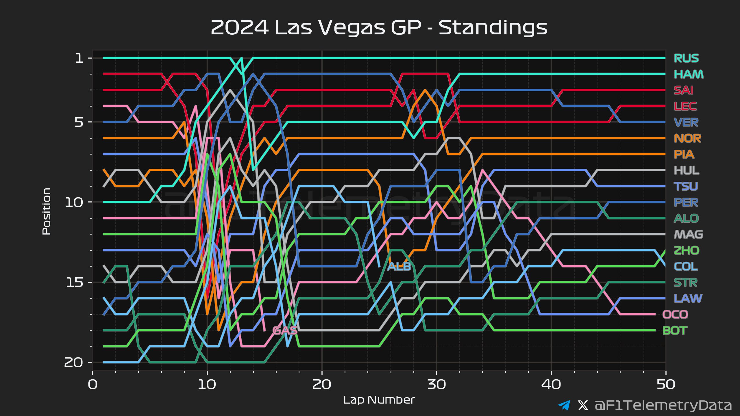 LAP 15 훌켄버그 피트스탑 하드타이어로 교체후 16위로 복귀. 베르스타펜 페레즈 추월하며 2위. 피아스트리 가슬리 추월하며 13위.