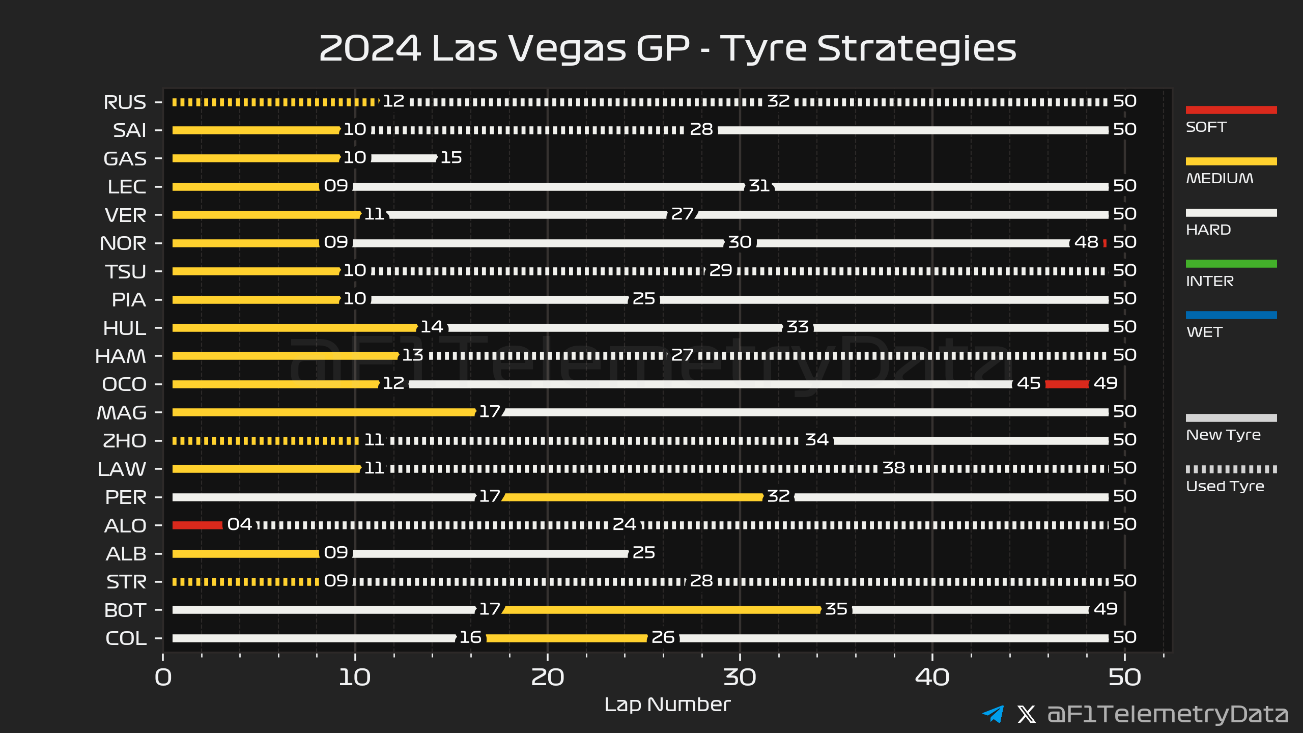 상위 10명은 모든 드라이버가 미디엄 타이어를 장착하고 나왔으며 하위권에서는 알론소가 소프트를 비롯해 몇몇은 소프트를, 몇몇은 하드 타이어를 장착하고 나왔습니다.