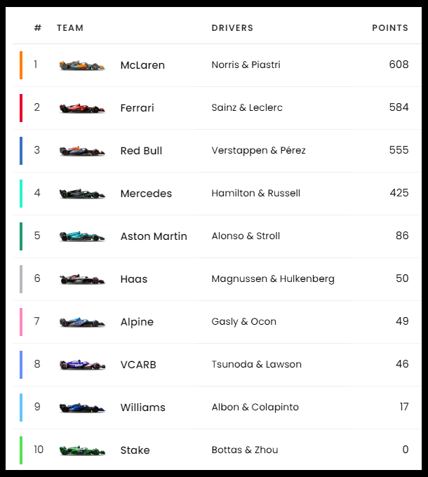 ■ 페라리는 사인츠와 르끌레르가 3위와 4위로 경기를 마치면서 6,7위에 거친 멕라렌 듀오보다 많은 포인트를 획득하며 멕라렌과의 포인트 격차를 24포인트로 줄이면서 컨스트럭터 타이틀 경쟁에 불이 붙게 되었습니다.