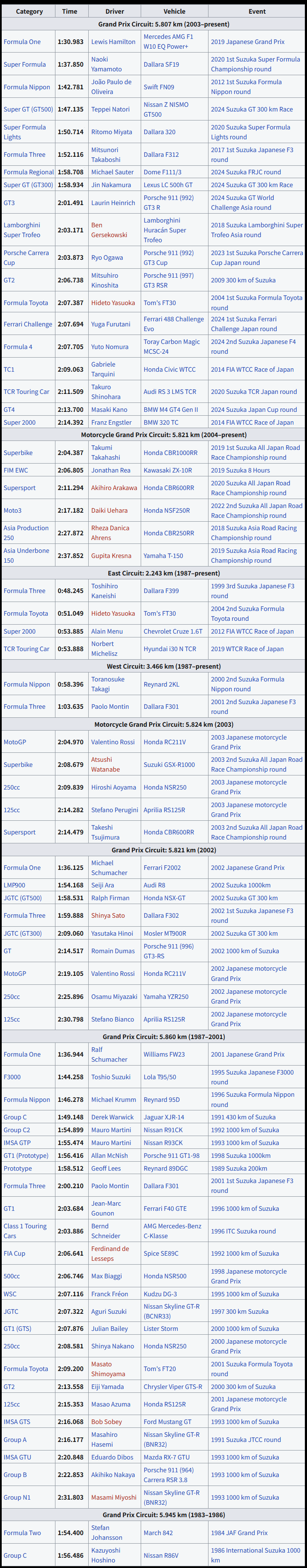 스즈카 서킷 트랙 기록들