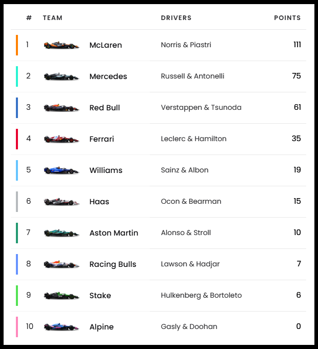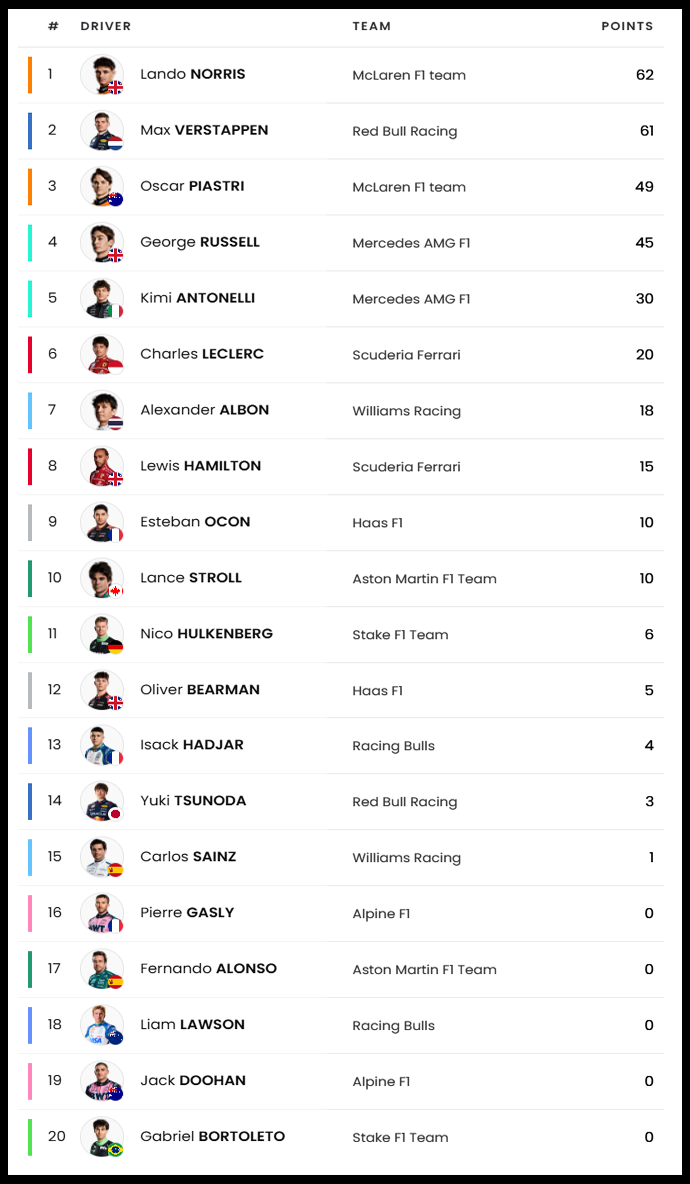 현재순위 안토넬리 해밀턴 베르스타펜 노리스 피아스트리 르끌레르 러셀 로슨 하자르 사인츠 알본 오콘