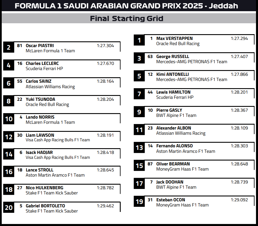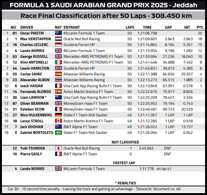 ( F1 2025 Saudi Arabia GP Race Results )