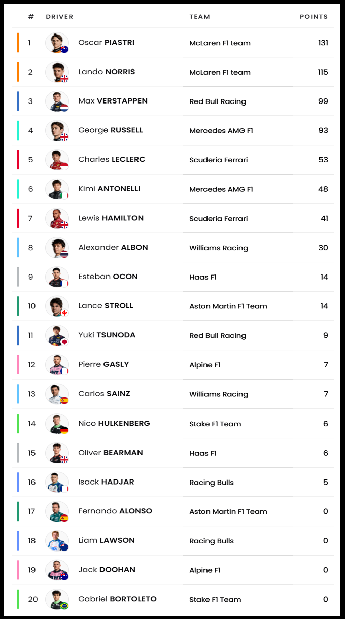 | 6 | 마이애미 GP | 노리스 | 베르스타펜 | 피아스트리 | 노리스 | 멕라렌 |