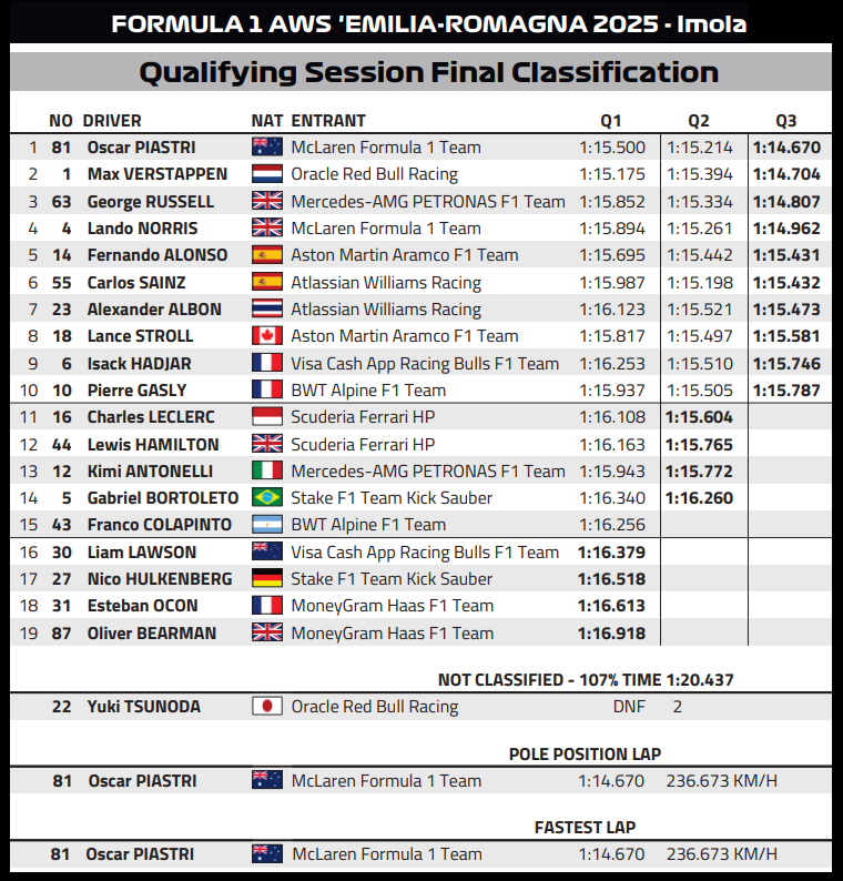 (F1 2025 Emilia-Romagna GP Qualifying Results)