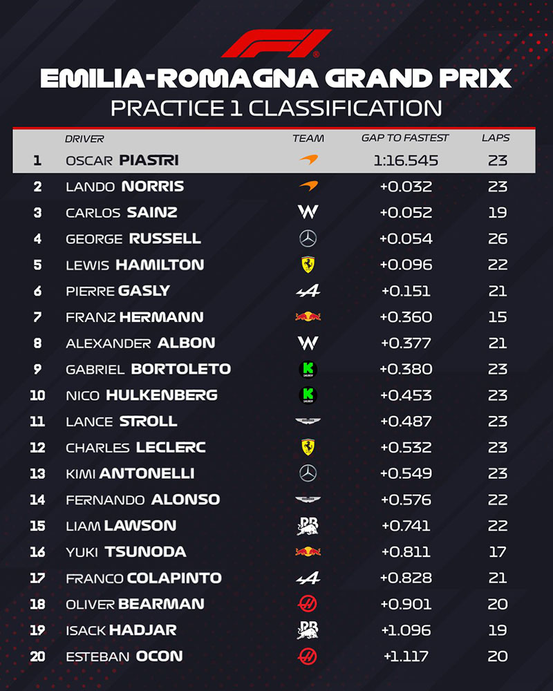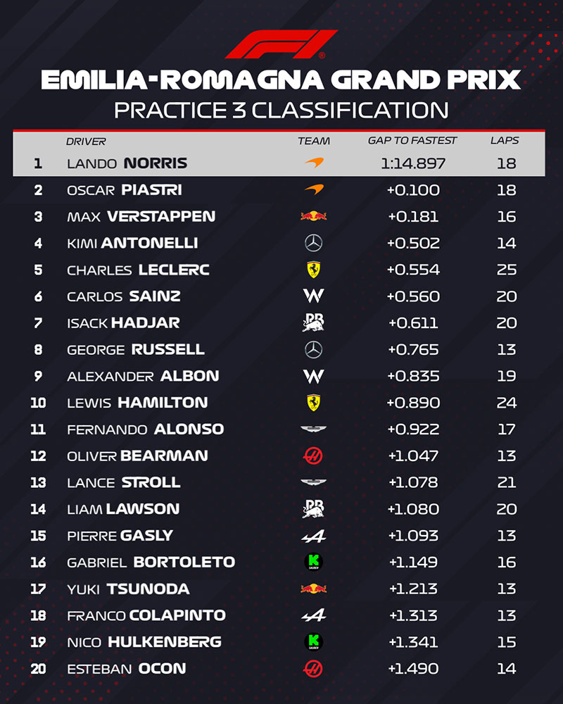 F1.2025.R07 - 에밀리아-로마냐 그랑프리 예선 결과 (F1 2025 Emilia-Romagna GP Qualifying Results)