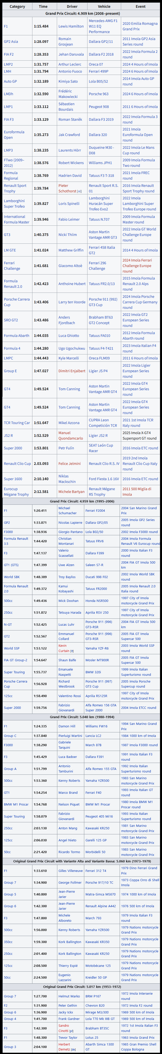이몰라 서킷은 F1서킷중에서 시계 반대 방향으로 달리는 몇 안되는 서킷 중 하나이며 이 서킷의 공식적인 이름은 페라리의 설립자Enzo Ferrari 와 그의 아들 Alfredo Ferrari 의 이름을 따서 지어졌지만 이몰라 서킷으로 더 유명합니다. 공식 명칭은 Autodromo Internazionale Enzo e Dino Ferrari 입니다.