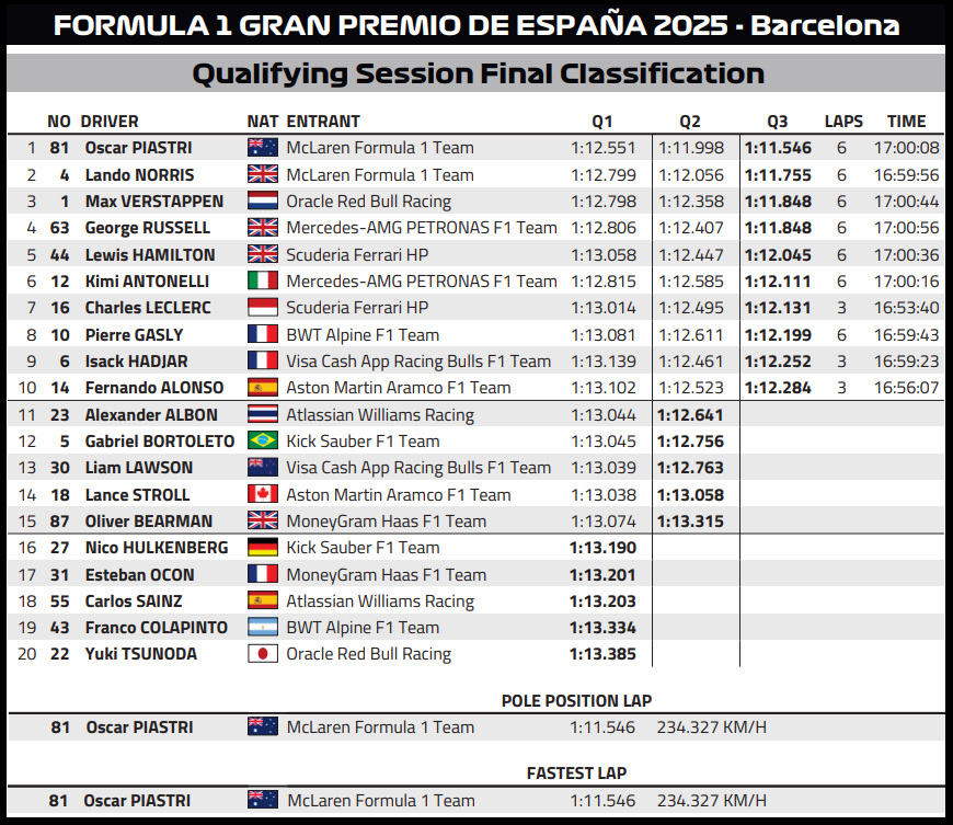 F1.2025.R09 - 스페인 그랑프리 예선 결과 (F1 2025 Spain GP Qualifying Results)